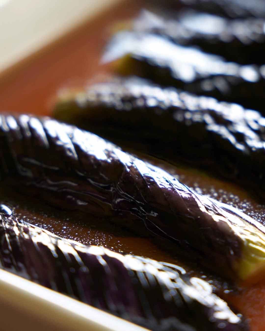 With agebitashi, the way you cut the eggplant can influence the final flavor. This is because the cut surface of the flesh is the part that absorbs the oil.